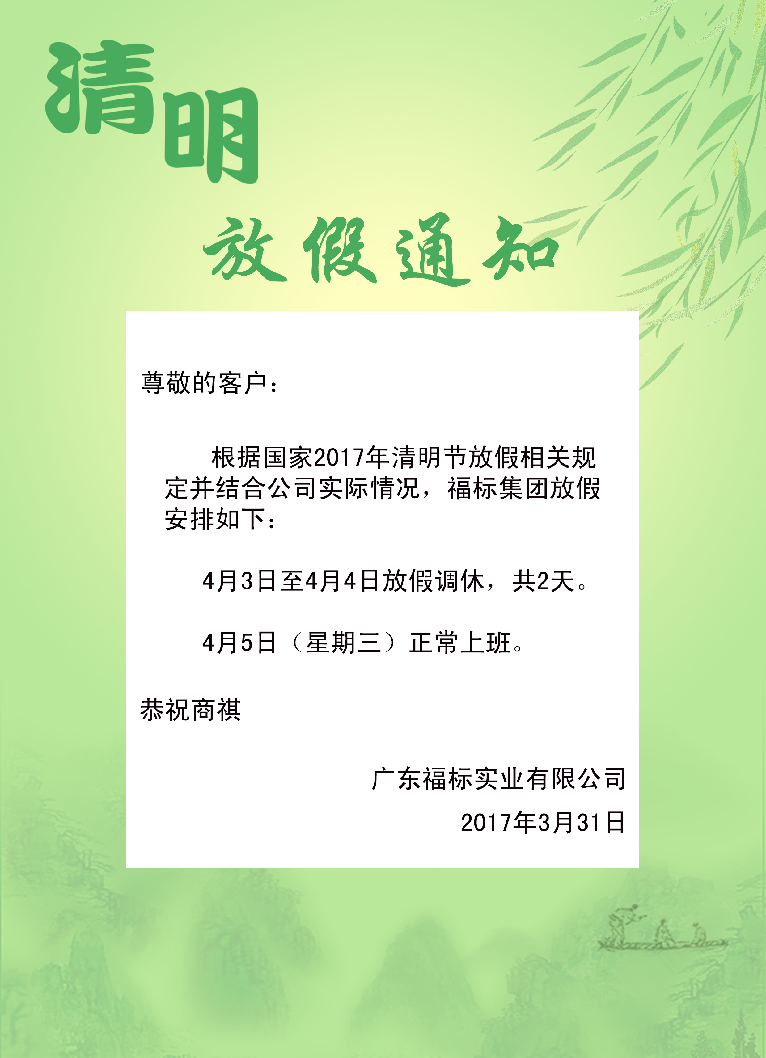 福标集团2017清明放假通知