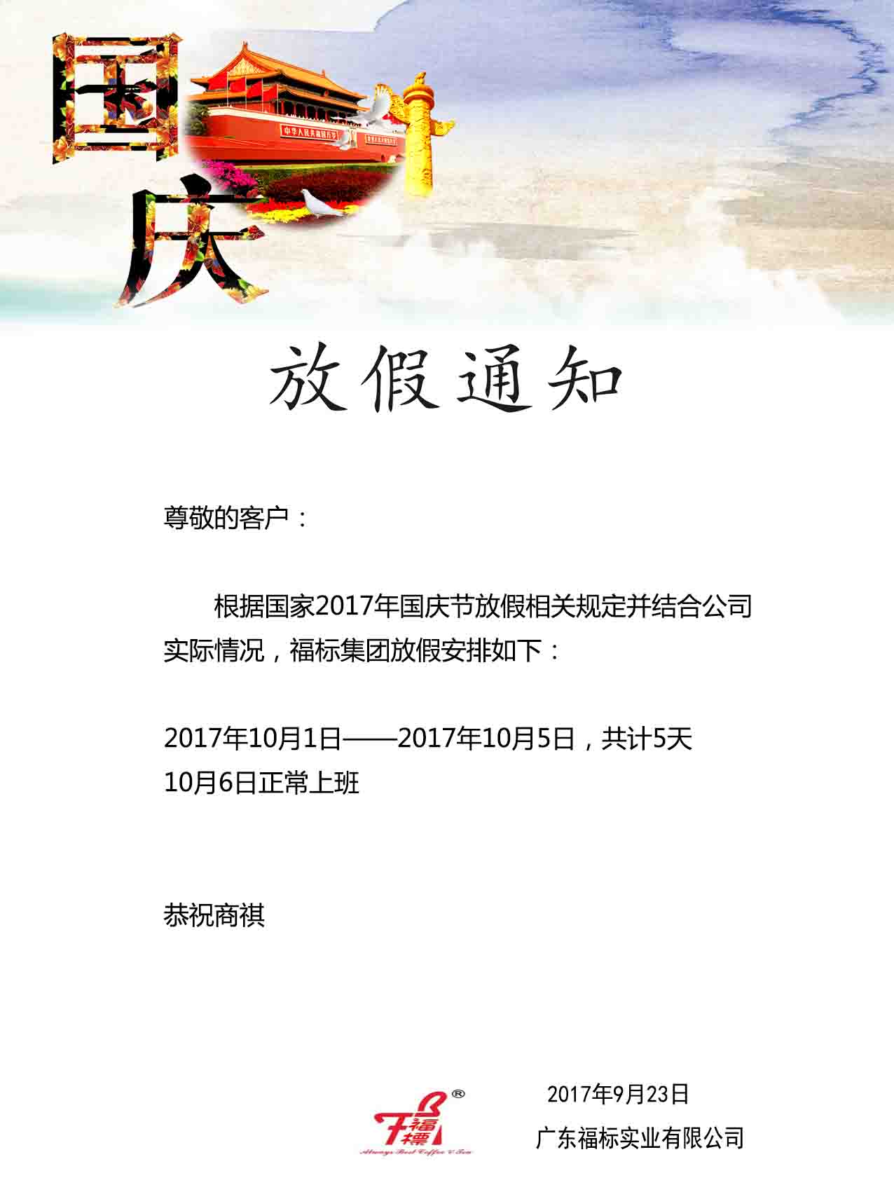 福标集团2017国庆节放假通知
